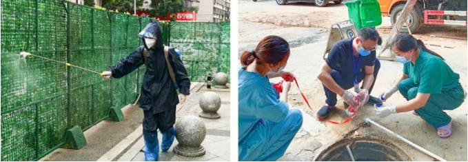 ▲濱??h疾控中心工作人員對設(shè)施設(shè)備作全面消殺]