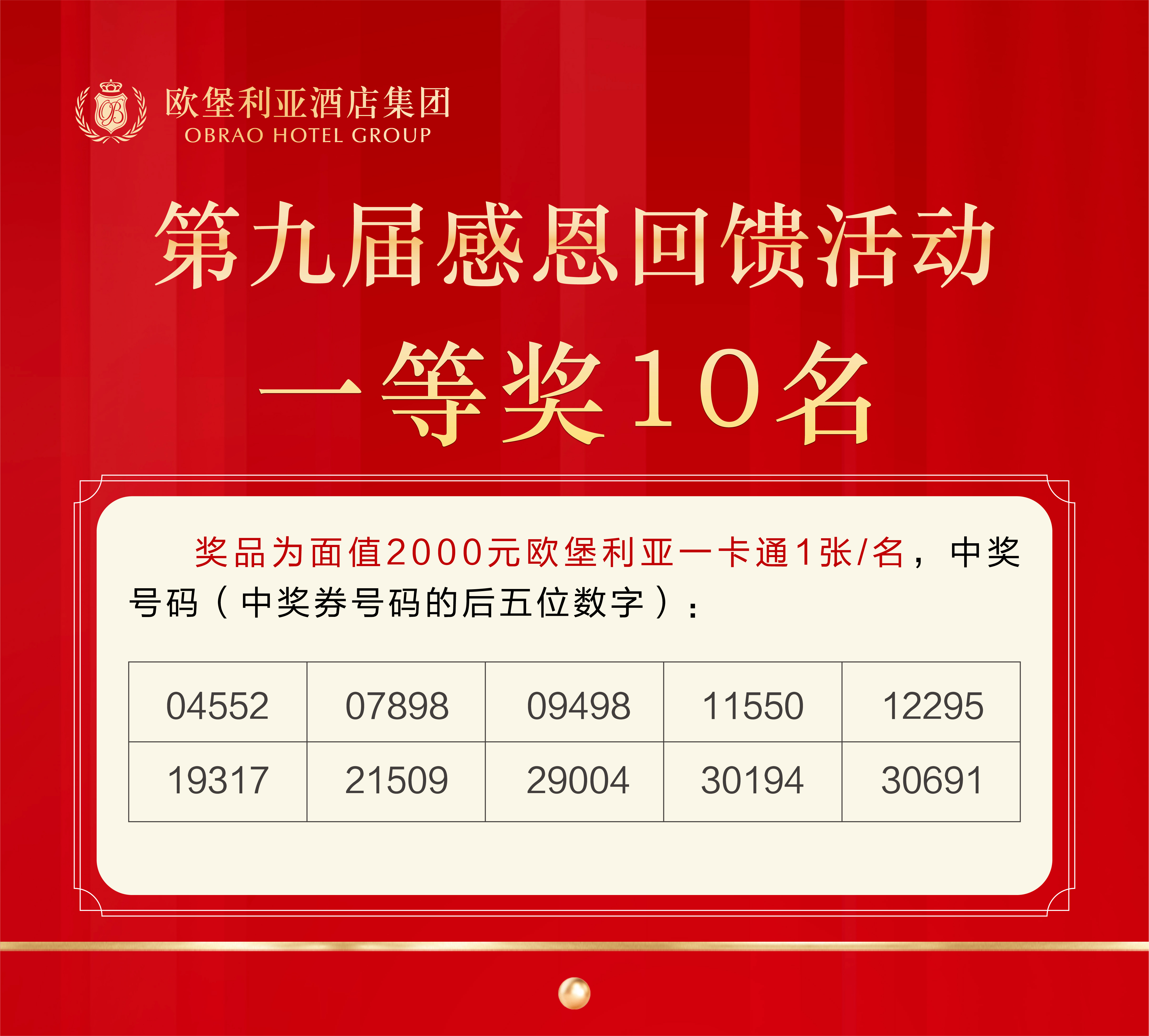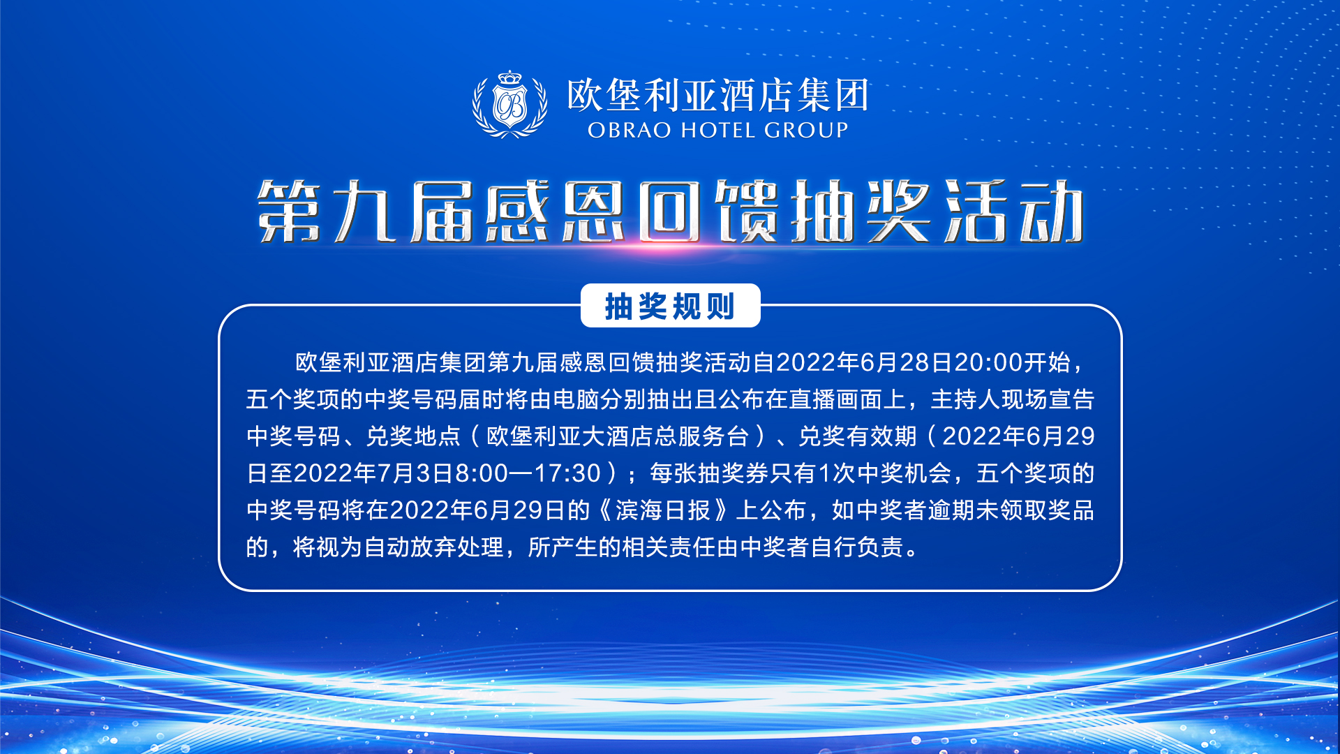 2022年6月29日,歐堡利亞酒店集團第九屆感恩回饋活動五個獎項的311個中獎號碼均已刊登在《濱海日報》上。