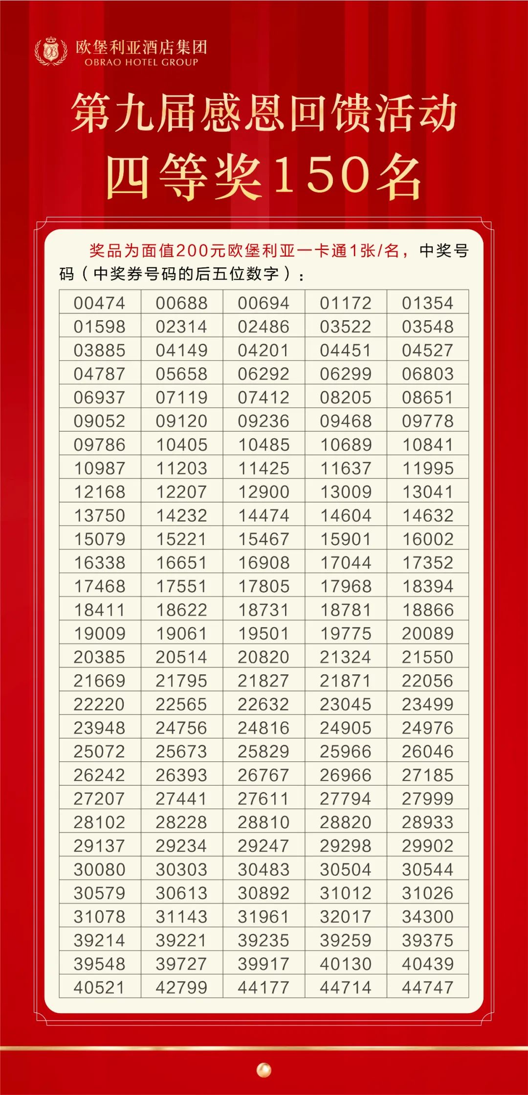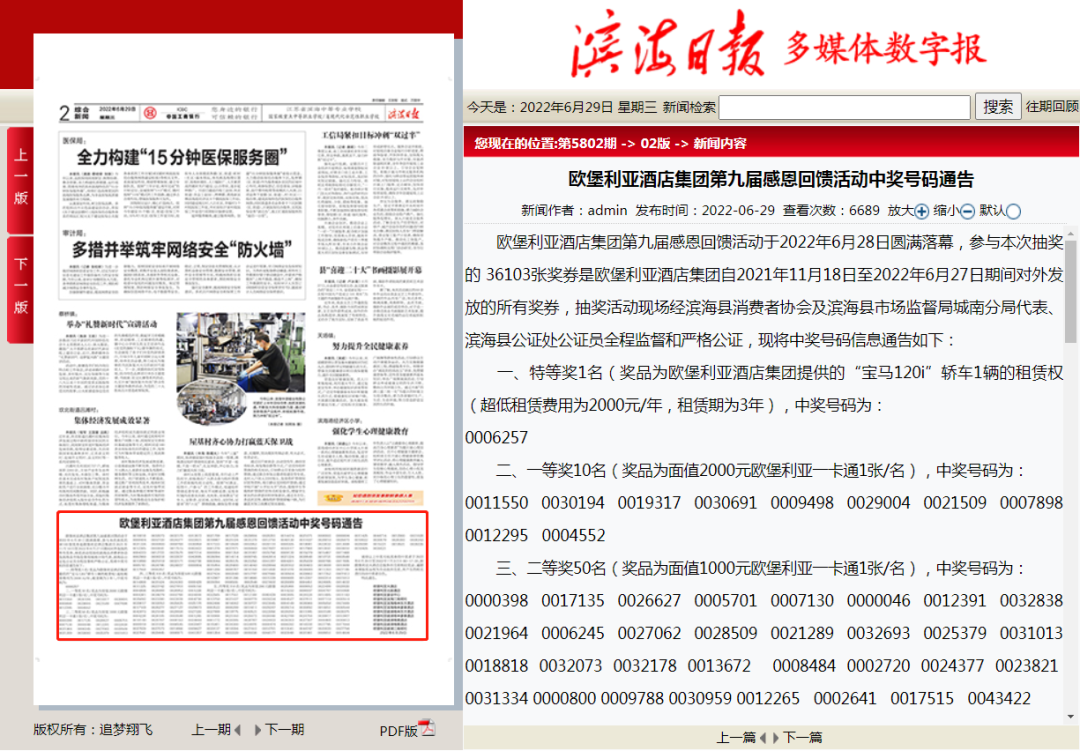 2022年6月29日,歐堡利亞酒店集團(tuán)第九屆感恩回饋活動(dòng)五個(gè)獎(jiǎng)項(xiàng)的311個(gè)中獎(jiǎng)號(hào)碼均已刊登在《濱海日?qǐng)?bào)》上。
