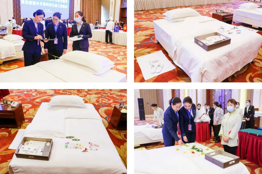 客房服務參賽選手甩單動作特別瀟灑,雙手抓住床單的兩角,只聽“嘩”的一聲,床單向床頭飛出,隨即往下一按,一手平伸一撫,一手輕抬床墊,撫床單的手再做成手刀往床底下一砍,床單的一角就坦蕩如砥地壓在床墊下,有條不紊、一氣呵成的動作頻繁劃出了一道道優(yōu)美的弧線,床腳呈現(xiàn)出一個標準的90度,四周緊密無褶皺,3分鐘內鋪就了一張張舒適、整潔、美觀的床;創(chuàng)意新穎、實用性強、藝術感好的一件件夜床作品凸顯了客房服務參賽選手對賓客的感動式服務、個性化關懷,這是充分體現(xiàn)一個酒店細節(jié)服務的很好途徑。