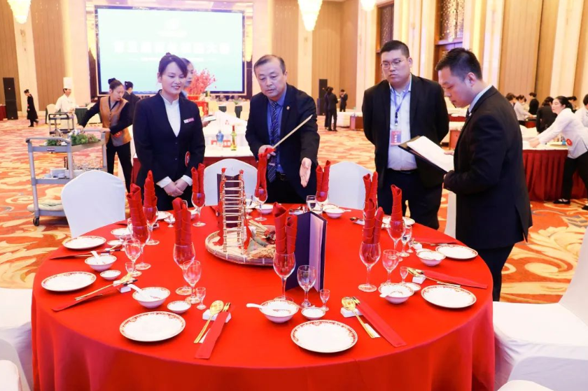 第五屆崗位技能大賽設有客房服務(分為A、B兩組)、餐廳服務(分為A、B兩組)、前廳服務(分為A、B兩組)、熱菜制作、冷菜制作、精細刀工、保安實操、工程維修、財務技能共計9個比賽項目,經過參賽單位或部門學習標準、組織培訓、強化練習和層層選拔,參賽選手充分利用一切可以利用的業(yè)余時間,盡管日常工作后有些許勞累,卻依然毫無怨言地苦練崗位技能、用心奮力備賽。在主持人宣布第五屆崗位技能大賽開始后,身穿職業(yè)裝、佩戴評委證的大賽評委偕同身著工作裝、別著參賽牌的參賽選手,精神抖擻、笑容滿面地邁著整齊有力的步伐向各比賽區(qū)挺進。