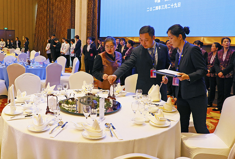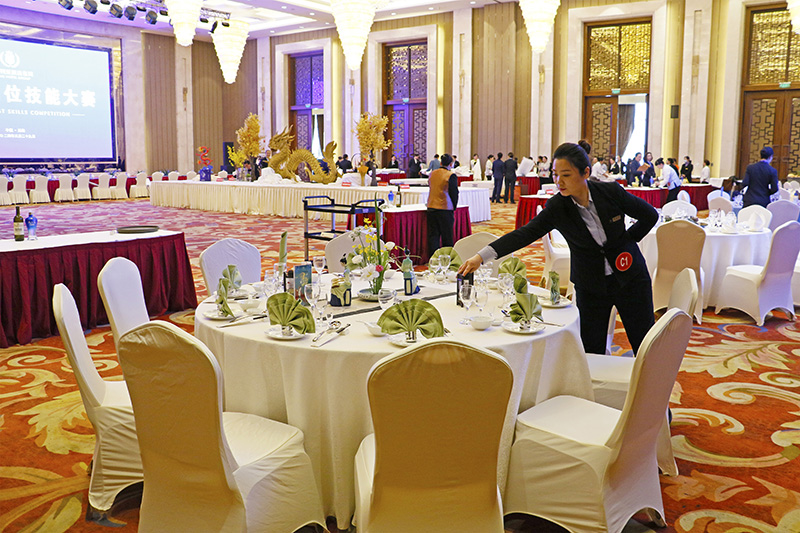 餐廳服務參賽選手面帶微笑、步履輕盈、全神貫注、有條不紊,一舉一動間迸發出規范、標準、優雅、自信,輕輕一拋、準確無誤地將臺布十字居中地鋪在餐桌上,又從主人位開始拉椅定位,麻利地將碗、碟、盤、勺、筷架、筷子、三套杯等一整套光潔的餐具依序擺開,整個桌面呈現出層次分明、中心對稱的擺臺造型;擺放好餐具后,參賽選手旋即拿起了一塊平淡無奇的餐巾,竟能折出多種花型,頓時使擺放整齊美觀的餐具增添了藝術美感。