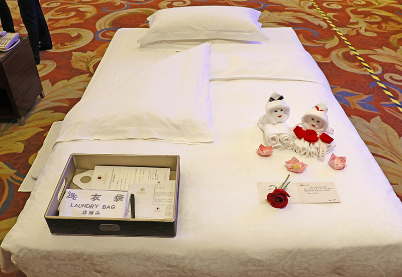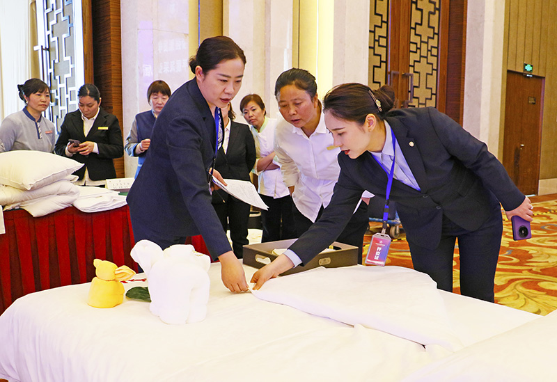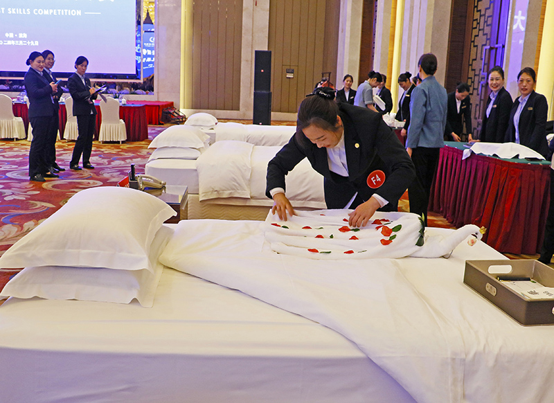客房服務參賽選手甩單動作特別瀟灑,雙手抓住床單的兩角,只聽“嘩”的一聲,床單向床頭飛出,隨即往下一按,一手平伸一撫,一手輕抬床墊,撫床單的手再做成手刀往床底下一砍,床單的一角就坦蕩如砥地壓在床墊下,有條不紊、一氣呵成的動作頻繁劃出了一道道優美的弧線,床腳呈現出一個標準的90度,四周緊密無褶皺,3分鐘內鋪就了一張張舒適、整潔、美觀的床;創意新穎、實用性強、藝術感好的一件件夜床作品凸顯了客房服務參賽選手對賓客的感動式服務、個性化關懷,這是充分體現一個酒店細節服務的很好途徑。