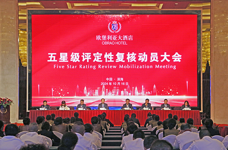 為廣泛動員全體員工以最飽滿的工作激情、最佳的精神狀態,切實做好五星復核迎檢備查工作,致力以零缺陷的硬件、零失誤的服務,堅決打贏五星復核攻堅戰,確保五星級旅游飯店評定性復核工作順利通過,2024年10月16日,歐堡利亞大酒店在歐堡廳隆重召開了“五星級評定性復核動員大會”,鹽城市文廣旅局市場管理處處長于將及星級酒店負責人杭榮春、濱海縣文廣旅局副局長李臻球及市場管理科科長吳慧明出席會議,歐堡利亞酒店集團總經理兼歐堡利亞大酒店董事長鄧棟作了動員報告,歐堡利亞大酒店總經理胡也華主持會議,歐堡利亞大酒店近200名員工參加了此次會議。
