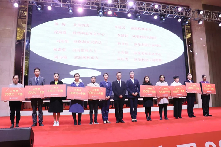 建湖格林豪泰酒店店長助理周蘭婷為10名三等獎(jiǎng)中獎(jiǎng)?wù)哳C獎(jiǎng)