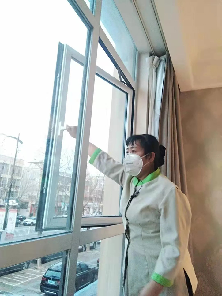 大堂、吧臺、每一間客房均放置了免洗消毒洗手液,為每一位進入酒店的賓客提供免費的清潔、消毒服務。客房服務員每天打掃客房更認真了,加大了對客房的消毒力度和頻率,嚴格保證客房物品一客一換,并在客房打掃清理干凈后開窗通風30分鐘以上。