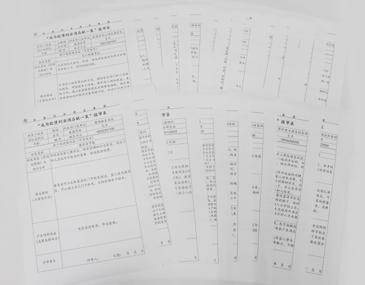 員工是企業發展的真正英雄。歐堡利亞酒店集團各部門、下屬各單位充分認識到“我為歐堡利亞酒店獻一策”對歐堡利亞酒店事業發展的重要性,不斷引導廣大員工增強企業主人翁的責任感,“我為歐堡利亞酒店獻一策”活動得到了各級管理人員的大力支持和廣大普通員工的廣泛響應,截至2020年6月15日,歐堡利亞酒店集團各部門、下屬各單位著重從企業文化、經營管理、市場營銷、教育培訓、服務質量、菜品品質、工程建設、節能降耗等方面,累計提交了351份《“我為歐堡利亞酒店獻一策”報審表》,其中92%的計策或建議都是由平凡崗位上的員工通過深度思考、認真醞釀、積極主動為歐堡利亞酒店事業可持續發展而獻出的金點子、好創意。