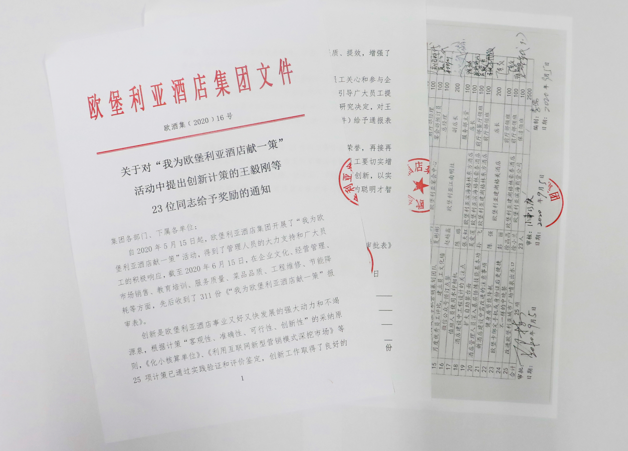 創新是引領發展的第一動力。《化小核算單位》、《利用互聯網新型營銷模式深挖市場》等賦有創新性的25項計策已通過實踐驗證和有效落實,創新工作在經營管理工作中開了花、結了果。為大力實施創新驅動戰略,充分調動廣大員工關心和參與企業運營管理的積極性和創造性,全面鼓勵和深入引導廣大員工提高創新意識,切實提升企業的總體創新能力,2020年9月5日,歐堡利亞酒店集團對23位同志所提出的25項創新計策給予通報表彰和獎勵,有效增強了廣大員工主人翁的責任感、緊迫感、使命感,促使歐堡利亞酒店經濟提速、提量、提質、提效。