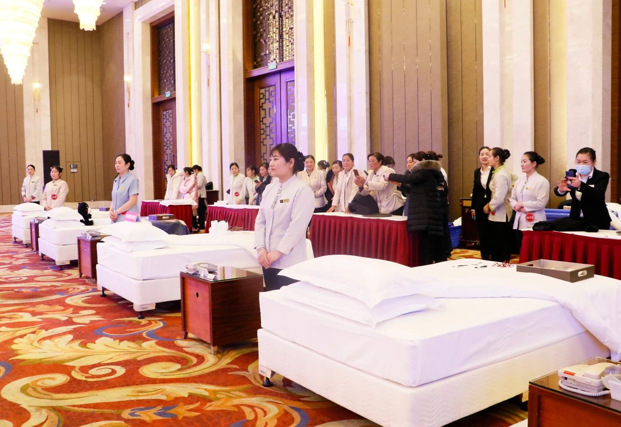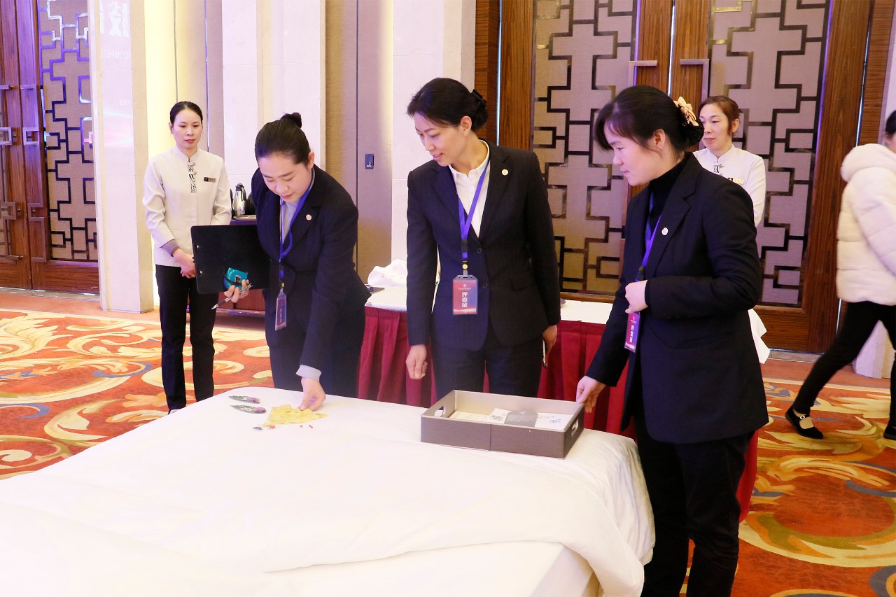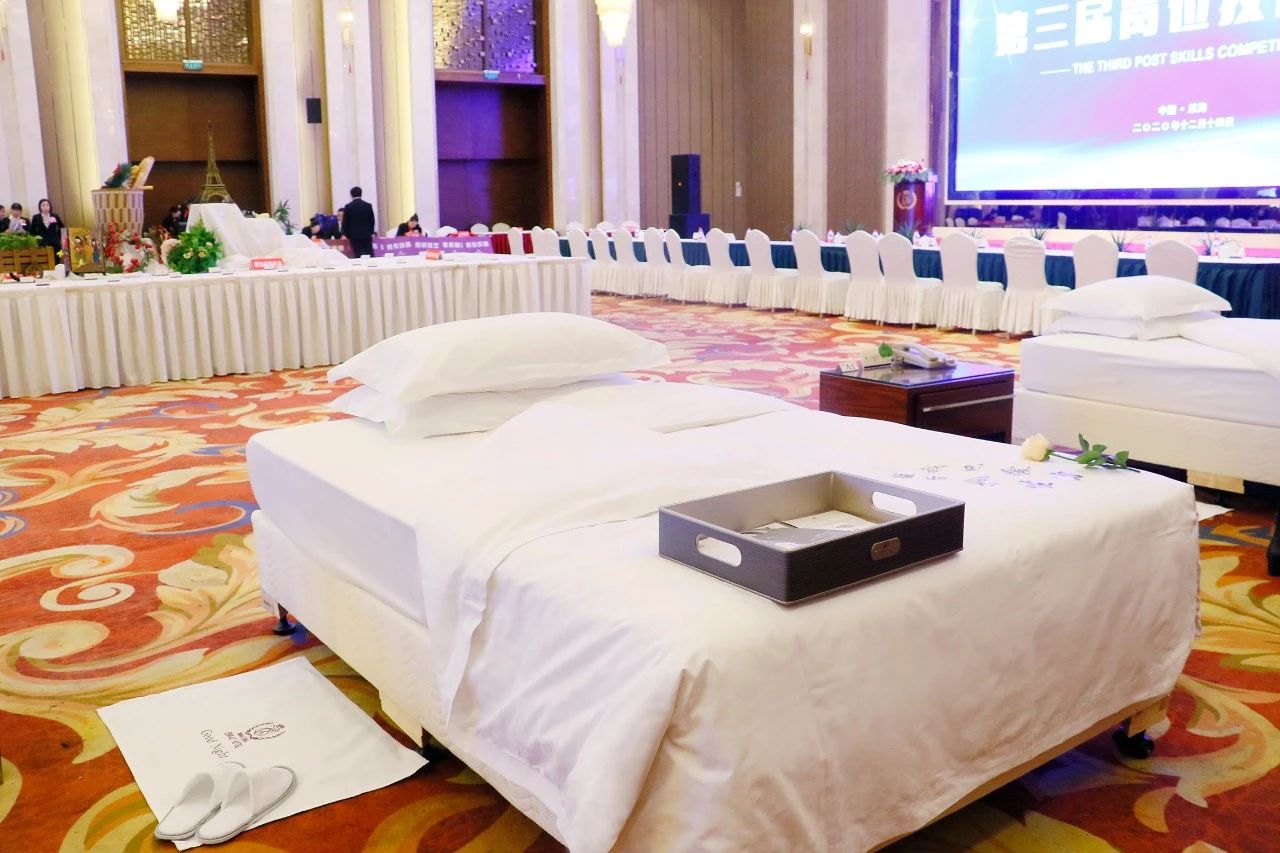 客房服務的參賽選手雙手抓住床單的兩角,床單向床頭飛出,隨即往下一按,一手平伸一撫,一手輕抬床墊,撫床單的手再做成手刀往床底下一砍,床單的一角就坦蕩如砥地壓在床墊下,一系列動作頻繁劃出了一道道優美的弧線,一張舒適、整潔、美觀的床就在3分鐘內鋪就完畢;創意新穎、實用性強、藝術感好的一件件夜床作品凸顯了客房服務參賽選手對賓客的感動式服務、個性化關懷,為大賽評委和觀摩人員呈現了一場美輪美奐的視覺盛宴。