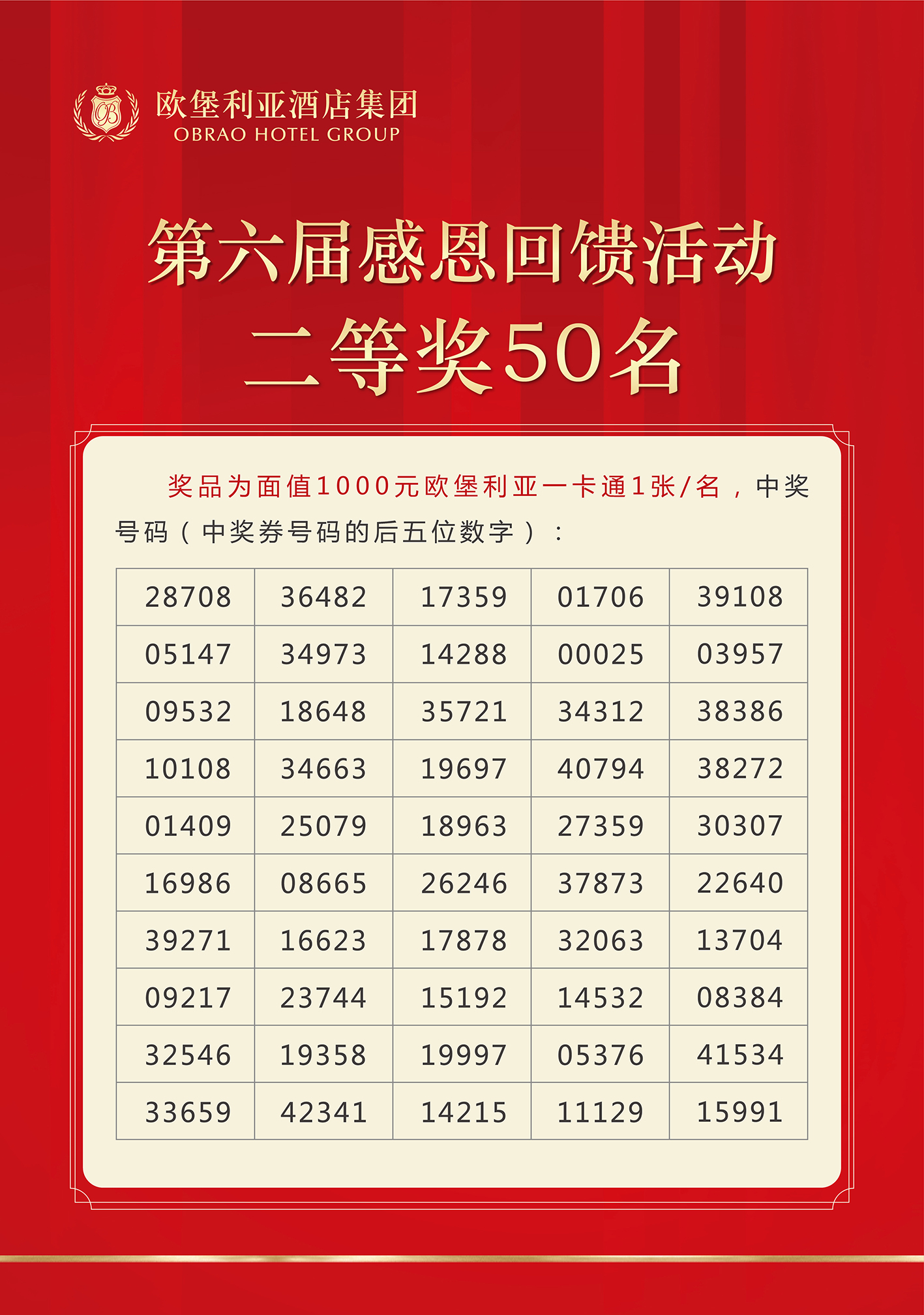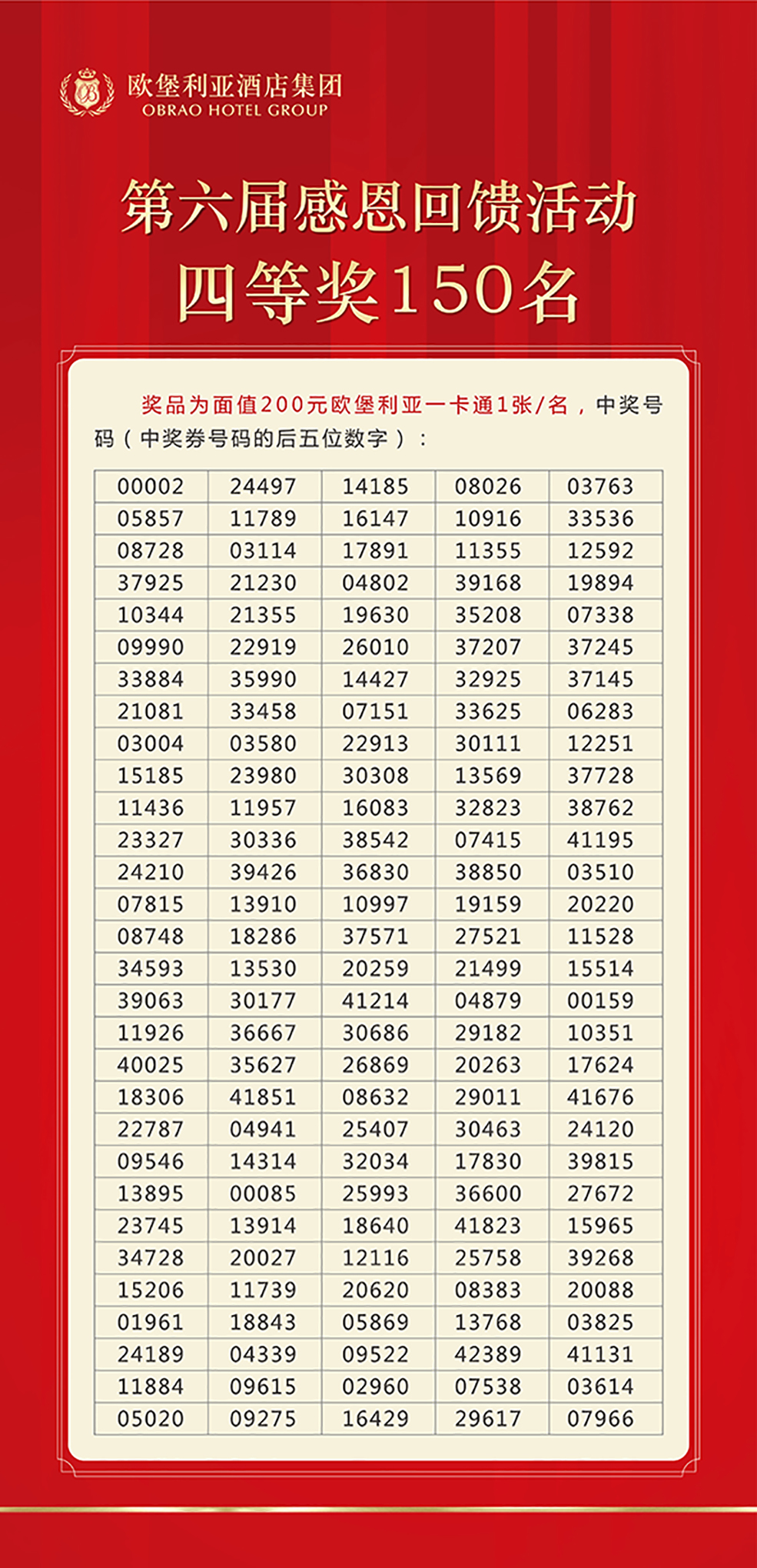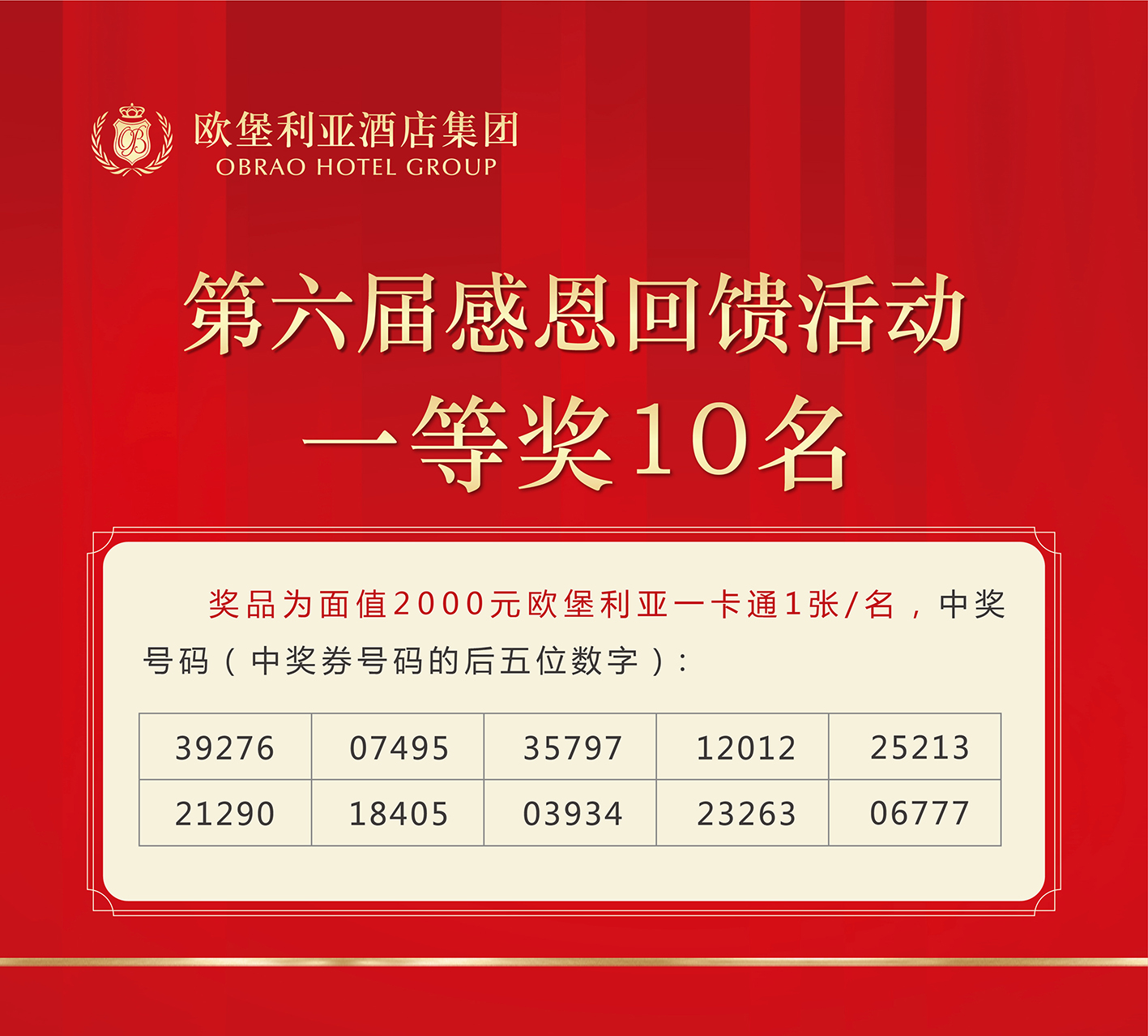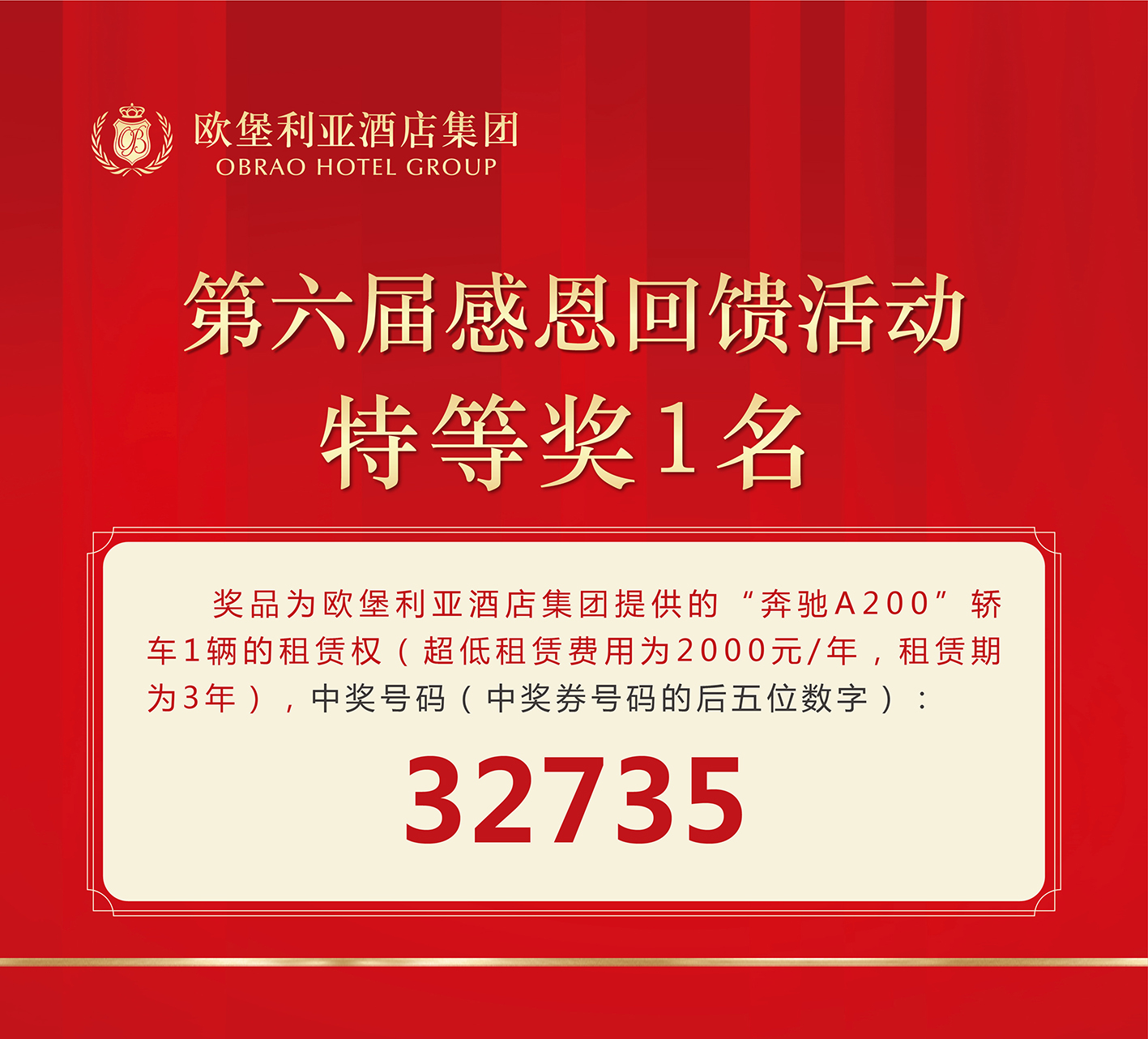 歐堡利亞酒店集團第六屆感恩回饋活動與眾不同的是抽取特等獎放在第一個抽獎環節,其目的是讓所有持有本屆感恩回饋活動抽獎券的賓客朋友都能有中得特等獎的機會,特等獎的中獎號碼(中獎券號碼的后五位數字)是32735。