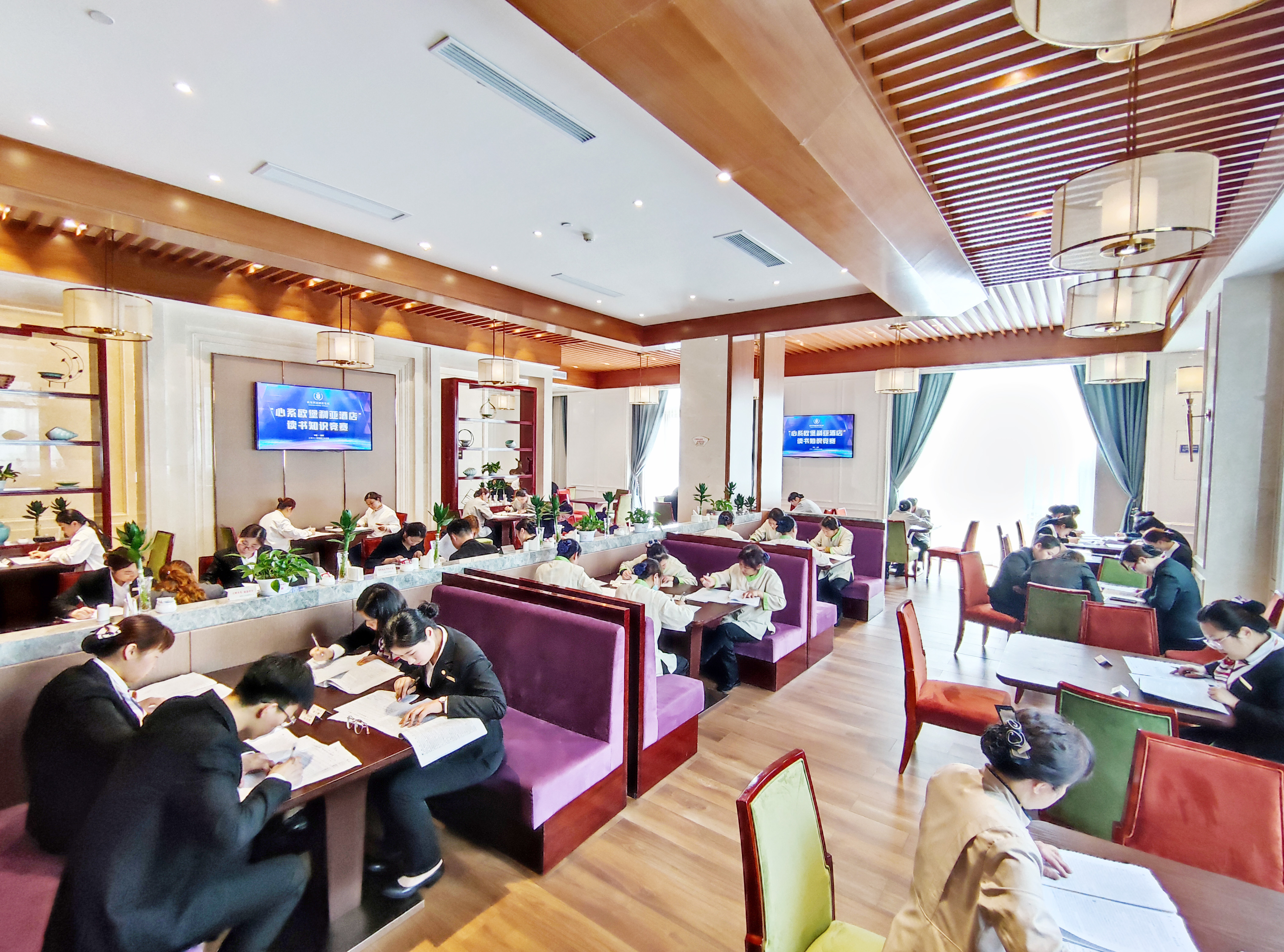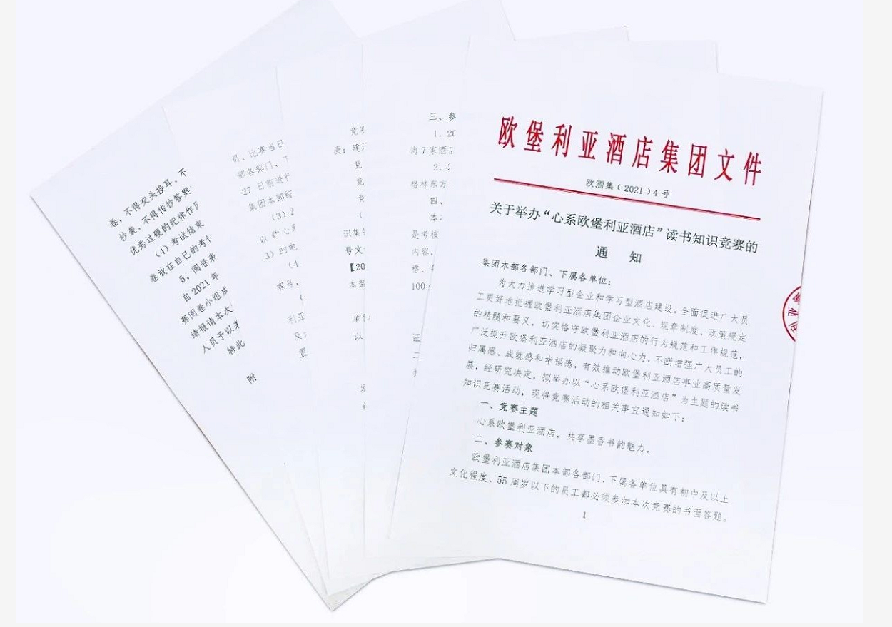為大力推進學習型企業和學習型酒店建設,全面促進廣大員工更好地把握歐堡利亞酒店集團企業文化、規章制度、政策規定的精髓和要義,切實恪守歐堡利亞酒店的行為規范和工作規范,廣泛提升歐堡利亞酒店的凝聚力和向心力,不斷增強廣大員工的歸屬感、成就感和幸福感,有效推動歐堡利亞酒店事業高質量發展,2021年3月15日,歐堡利亞酒店集團開啟以“心系歐堡利亞酒店,共享墨香書韻魅力”為主題的“心系歐堡利亞酒店”讀書知識競賽之旅,整個活動分為競賽啟動、學習宣貫、報名組織、競賽筆試、閱卷表彰五個階段。