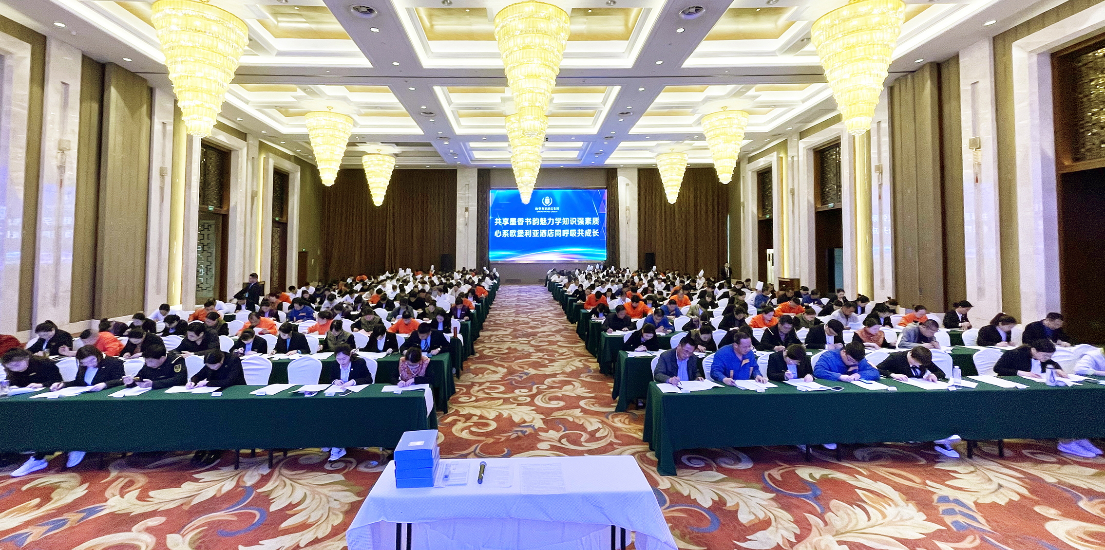 本次讀書知識競賽采取開卷的筆試形式,以員工應知應會的內容為基礎,重點考核企業文化、規章制度、服務質量、菜肴品質、市場營銷、消防安全等知識點。2021年4月28日14:00,歐堡利亞酒店集團“心系歐堡利亞酒店”讀書知識競賽筆試分別在歐堡利亞大酒店歐堡廳、歐堡利亞建湖格林東方酒店餐廳設立了考場,來自歐堡利亞酒店集團本部各部門和下屬各單位具有初中及以上文化程度、55周歲以下的374名員工參加了此次競賽筆試。