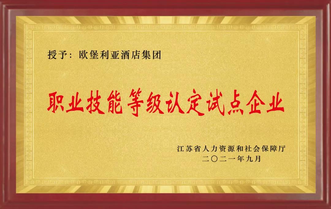 2021年9月29日,歐堡利亞酒店集團成功通過江蘇省職業技能等級認定備案,取得企業職工職業技能等級認定資質,被江蘇省人力資源和社會保障廳授予“職業技能等級認定試點企業”,成為濱??h目前唯一一家具備江蘇省職業技能等級認定資質的試點單位,這標志著歐堡利亞酒店集團在技能人才培養工作上迎來了一個新的里程碑,必將為歐堡利亞酒店事業高質量發展提供強有力的人才支撐。