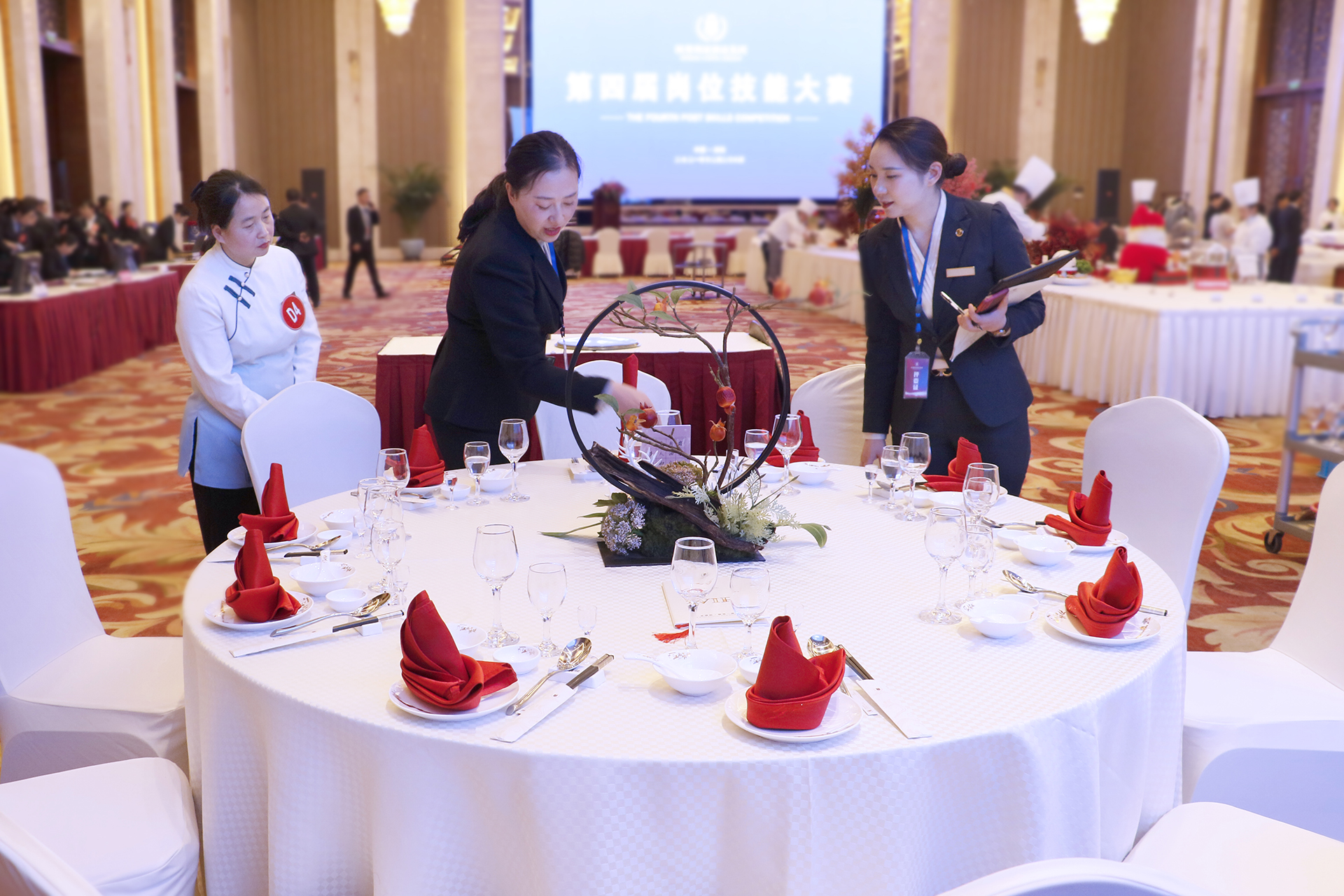 第四屆崗位技能大賽設(shè)有客房服務(wù)(分為A、B兩組)、餐廳服務(wù)(分為A、B兩組)、前廳服務(wù)(分為A、B兩組)、熱菜制作、冷菜制作、精細(xì)刀工、保安實(shí)操、工程維修、財(cái)務(wù)技能共計(jì)9個(gè)比賽項(xiàng)目,經(jīng)過參賽部門、參賽單位的學(xué)習(xí)標(biāo)準(zhǔn)、組織培訓(xùn)、強(qiáng)化練習(xí)、層層選拔強(qiáng)化培訓(xùn)和層層選拔,參賽選手充分利用8小時(shí)之外的業(yè)余時(shí)間,盡管日常工作后有著些許勞累,卻依然毫無怨言地苦練崗位技能、用心奮力備賽。在主持人宣布第四屆崗位技能大賽開始后,身穿職業(yè)裝、佩戴評(píng)委證的大賽評(píng)委偕同身著工作裝、別著參賽牌的參賽選手,精神飽滿、信心百倍地邁著整齊有力的步伐向各比賽區(qū)挺進(jìn)。