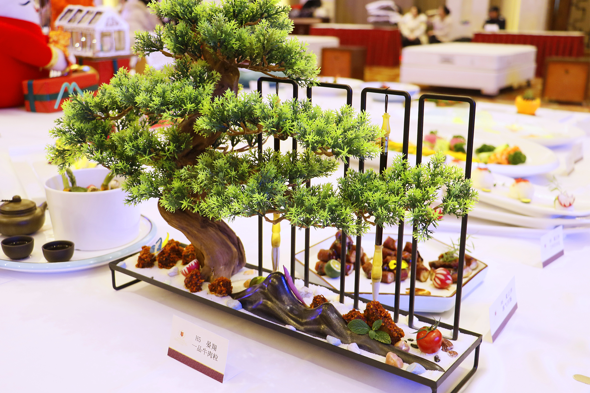 熱菜制作、冷菜制作、精細(xì)刀工的參賽選手紛紛拿出看家的本領(lǐng)、亮出練就的絕活,貌似很平常不過的每一道熱菜、每一盤冷菜、每一種面點(diǎn)、每一個(gè)刀法、每一項(xiàng)裝飾卻蘊(yùn)含著細(xì)致入微、精雕細(xì)琢、至真至誠,琳瑯滿目的精美食品燃起了一場(chǎng)味蕾風(fēng)暴,用色、香、味、形征服了賽場(chǎng)的所有人。